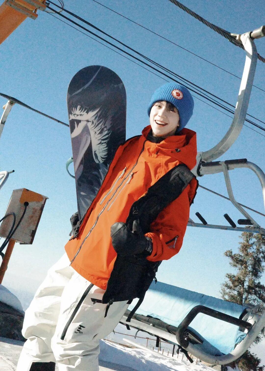 张乐康身着牛仔雪服,内搭针织毛衣,随性又不失质感。同色系棕色雪靴与手套相互呼应,将冬日运动穿搭的舒适与格调完美融合。
